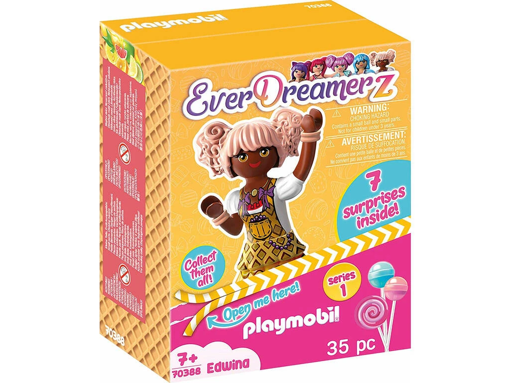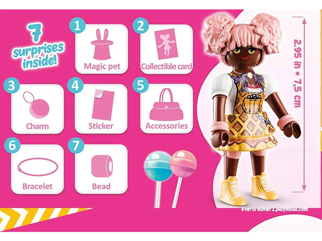 El pack incluye: 1 figura Playmobil Candy World Edwina Series 1 con 7 sorpresas como una mascota mágica, una tarjeta coleccionable, un charm, una pegatina especial, un accesorio, un brazalete y un abalorio.
