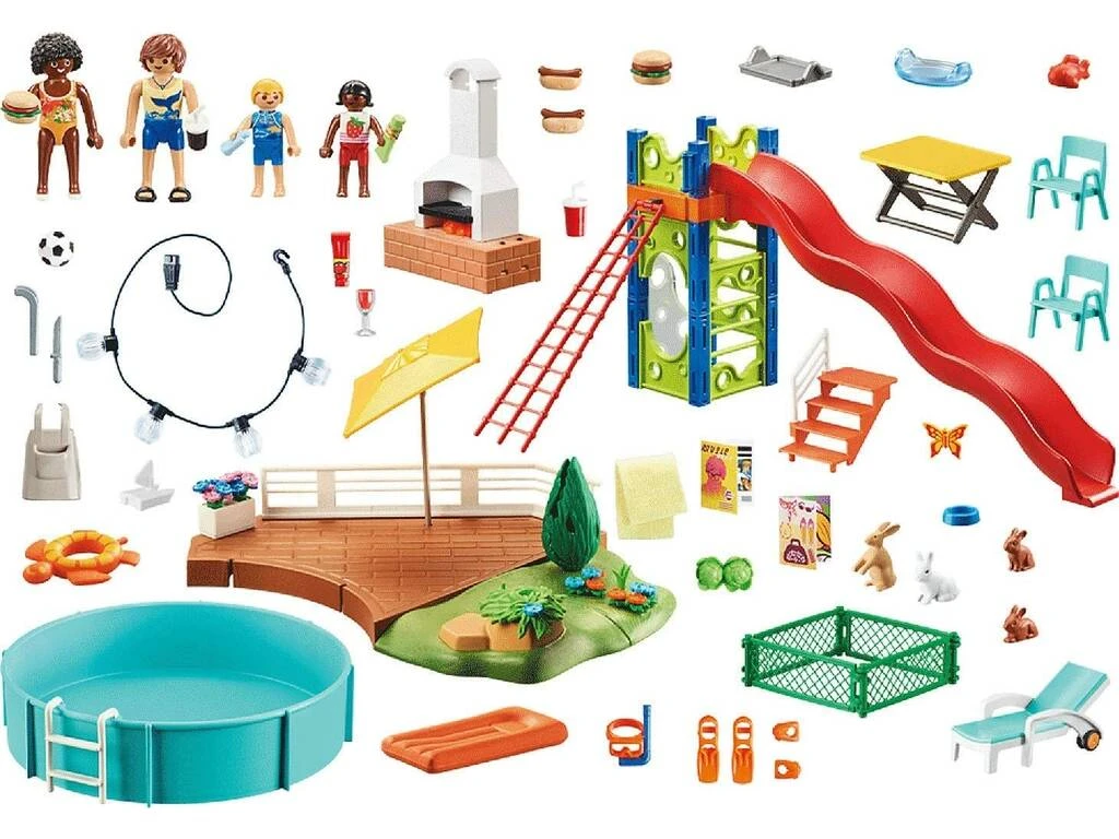 Prepara el jardín de tu casa moderna de Playmobil para el verano, con este set de Fiesta en la piscina con tobogán.