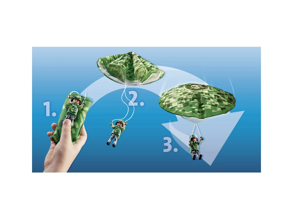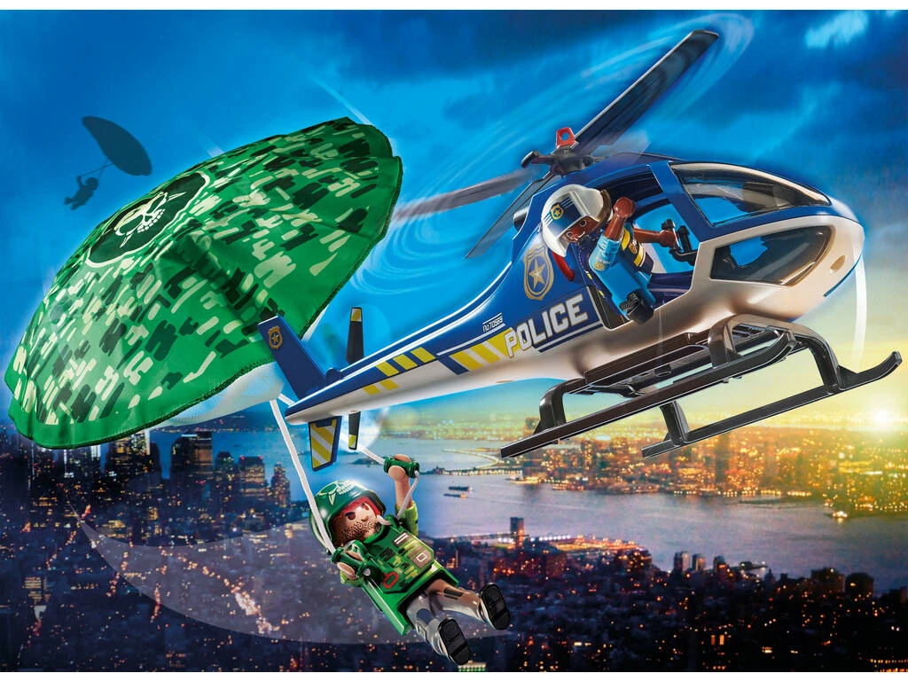 Incluye: 1 figura Playmobil policía, 1 figura Playmobil villano con paracaídas, 1 helicóptero de la policía, 2 cascos para las figuras y 1 pistola.