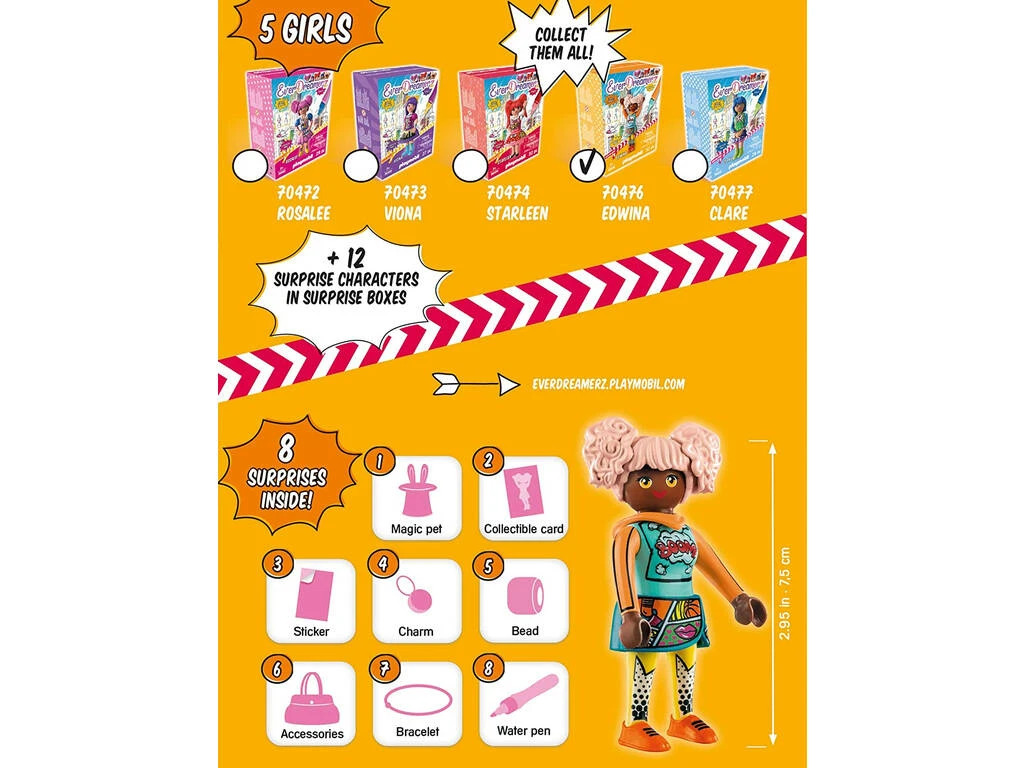 Incluye: 1 figura Edwina de Playmobil EverDreamerz Series 2 y 8 sorpresas (1 mascota mágica, 1 tarjeta coleccionable, 1 pegatina, 1 charm, 1 perla decorativa, 1 accesorio par ala muñeca, 1 brazalete y 1 rotulador de agua.