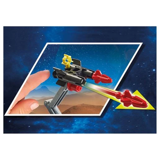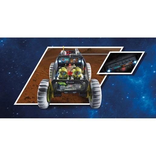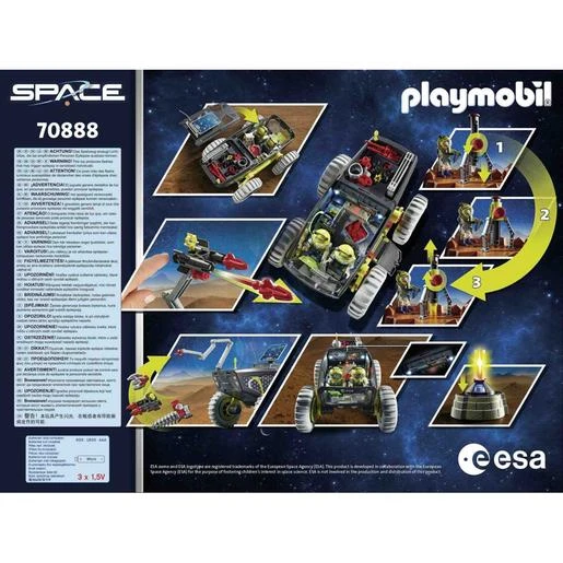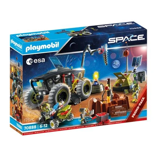 El set contiene dos astronautas Playmobil, un vehículo de Marte con módulo de luz y sonido, un triciclo de Marte, una estación de perforación, un laboratorio de investigación, un robot y muchos otros extras para realizar emocionantes misiones en Marte. Los brazaletes y los cascos de los astronautas son desmontables. Todos los mecanismos de luz y sonido tienen funciones de apagado automático.