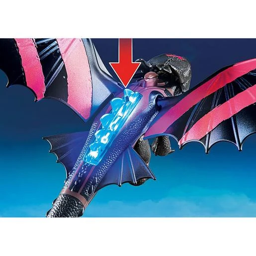 El set de juego incluye a Hipo y al dragón furia nocturna, Desdentao, con un aspecto de carreras. Hipo puede montar el dragón. Desdentao tiene una cresta que brilla y dispara rayos por la boca. Imcluye función luz LED y función de disparo. El módulo de luz necesita una micro pila de 1,5 V (AAA).